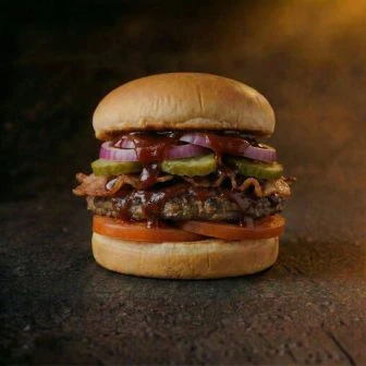 Говяжья котлета с ароматным беконом, свежими томатами и хрустящим огурцом. Красный лук и насыщенный соус барбекю придают бургеру яркий, слегка дымный вкус.