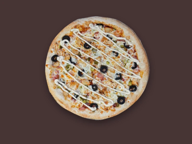 томатный соус, куриное филе, бекон, маринованные огурцы, маслины,моцарелла, соус чесночный