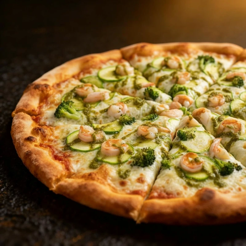 Нежные креветки, брокколи и цукини под тянущейся моцареллой с ароматным соусом песто и охотничьей основой.