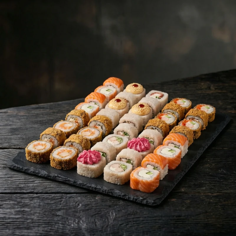 Дабл чиз, Филадельфия лайт, Арико темпура, Эби сан темпура и Запечённый с беконом — разнообразное сочетание холодных, горячих и запечённых роллов (40шт)