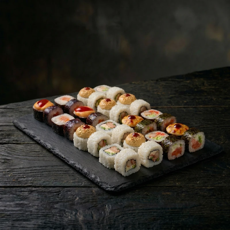 Мистер Черри, Доминикано, Фишка и Изи — ассорти роллов с курицей, сыром и нежными соусами. (32шт)
