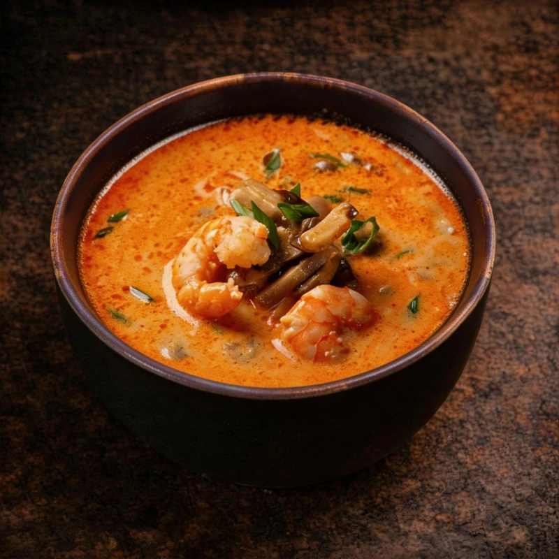 Ароматный тайский суп с креветками, лососем и кальмаром в насыщенном бульоне на основе пасты том ям и кокосового молока. Дополняется шампиньонами, помидорами черри и подаётся с рисом.