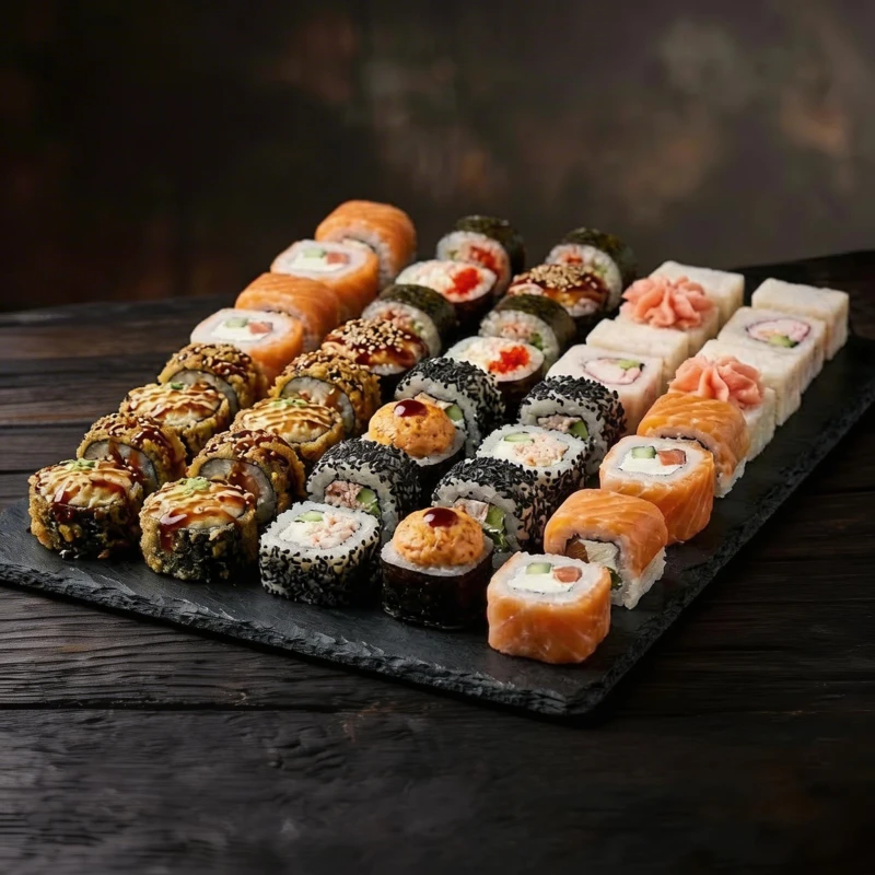Токачи, Лава с крабом, Сенсей, Джуронг и Эби фурай — разнообразное ассорти роллов с лососем, креветкой, крабом и нежными соусами. (40шт)
